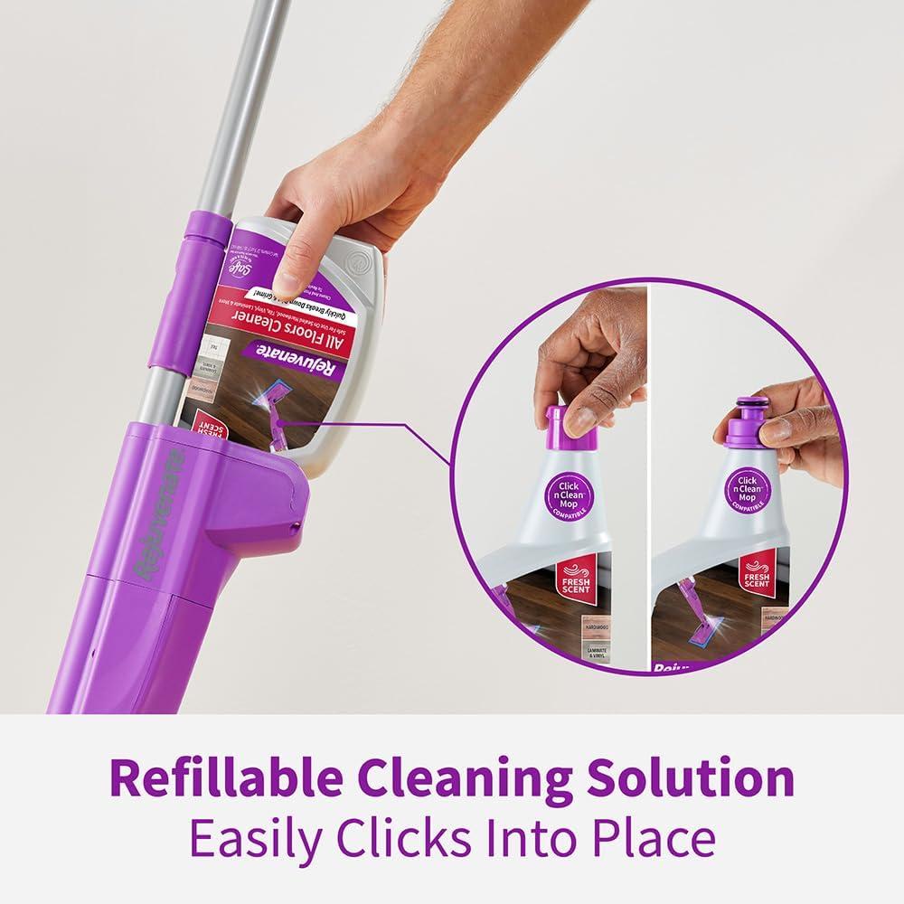 Professionals everywhere agree that Rejuvenate brand cleaning products Reveal The Beauty™ of homes everywhere. Rejuvenate’s Click n Clean Multi-Surface Spray Mop System combines the best cleaning products to make it easier and faster to clean your floors with little effort. This all-in-one kit includes an adjustable spray mop with a flexible swivel head, one microfiber reusable cleaning pad, one reusable microfiber dusting pad, one 32oz No Bucket Floor Cleaner from Rejuvenate, three bottle adapters, soft scrub pad and one FREE BONUS click-on grout brush to become an awe-inspiring wood floor cleaner, laminate floor cleaner, tile and grout floor cleaner and more. This innovative mop system is so ingenious, it can be used with almost any Rejuvenate Floor Cleaning Products. You can use it with any 32oz – 40oz Rejuvenate Long Neck Bottle Cleaners including No Bucket Floor Cleaner, Luxury Vinyl Floor Cleaner, Marble, Granite & Stone Floor Cleaner, Tile & Grout Everyday Cleaner and Tile and Grout Deep Cleaner. The non-clogging mechanical trigger works directly with the directional mist nozzle to evenly spread cleaner over any flooring surface, making it easier to clean.